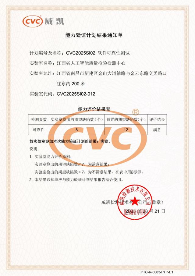 江西省人工智能质量检验检测中心顺利通过威凯检测技术有限公司组织的 CVC2025SI02 软件可靠性测试以及功能性测试能力验证计..